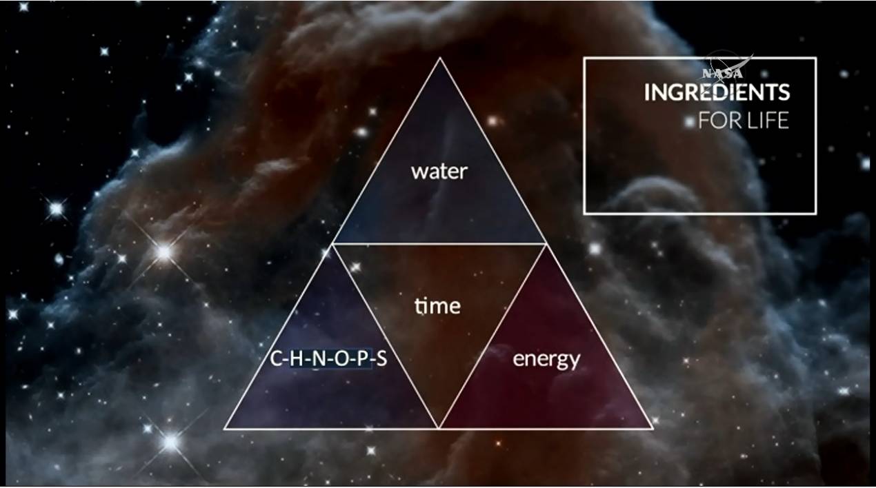 我们目前知道的生命所需要的三种必不可少的要素——水、(新陈代谢所需的)能量、关键化学元素(主要是碳、氢、氧、氮、硫、磷)。虽然土卫二距离地球十分遥远,是个小小冰冷的世界,然而,这些要素却几乎都存在。
