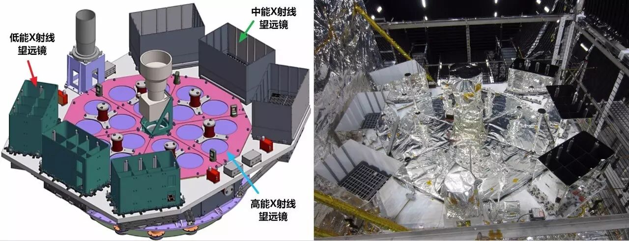 慧眼望远镜实际上包含三台望远镜,分别是高能、中能和低能X射线望远镜,分别负责探测20-250 keV,5-30 keV以及1-15 keV的X射线光子。左面是设计图。右面是实物照片,可见左下角机箱中的栅格装准直器