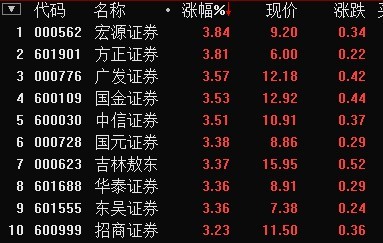 券商股周一早盘表现强势,盘中出现两轮冲高。截至11:02,广发证券涨停,宏源证券大涨7%,光大证券、国金证券、招商证券、东北证券等涨幅超5%,其余个股涨幅均超3%。