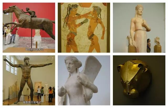 馆内有多个展厅,主要按年代区分,也有青铜器时代、爱琴海文明等,大多为金饰、铜器和雕像,有一个金制面具是爱琴海文明的重要标志,来自于葬墓发现。而这些古文明,都起源于分布于希腊海域境内的各个小岛,特别是米诺斯(Mykonos)文明就在我们没能前往的米岛。米诺斯文明萌芽于公元前3000年末,随而建立起奴隶制国家,与埃及有往来。