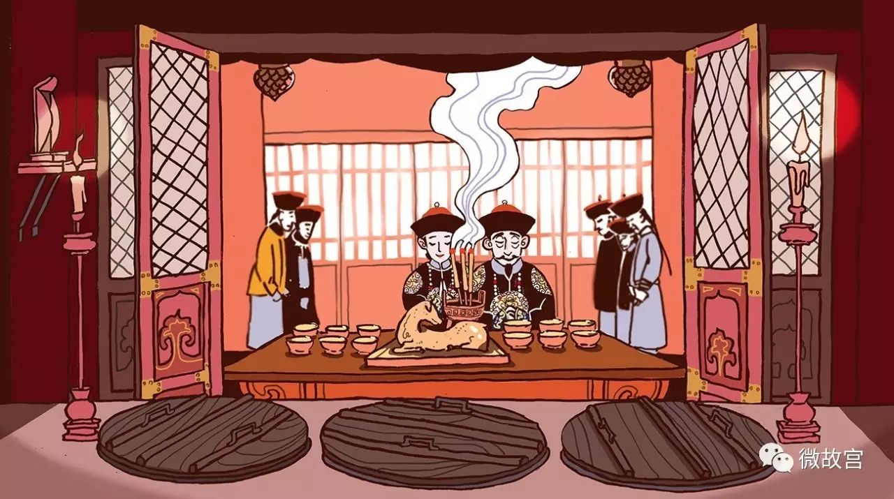 旧时紫禁城中也祭灶,“灶间”就在坤宁宫。坤宁宫内灶间东壁上设有灶君牌位:“东厨司命神牌”。从雍正时开始,每年腊月二十三日祭灶:设供案,奉神牌,备香烛、燎炉拜褥,御茶房、御膳房设供献三十二品、黄羊一只。祭祀时,宫殿监奏请皇帝皇后诣佛前、神前和灶君前拈香行礼。跟宫中其他仪典一样,异常严肃。