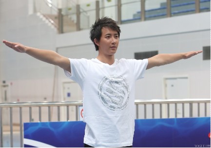 韩庚亮相江苏卫视《星跳水立方》节目训练。