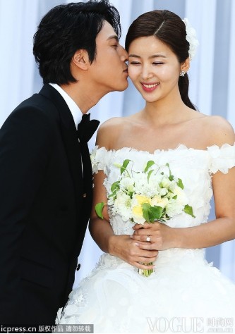 韩国首尔,韩在石、朴率美婚礼记者会举行。