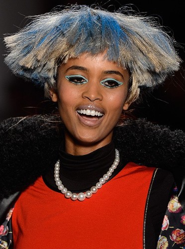 蓝色挑染OK,但是蘑菇一样的造型和蓝色闭合眼线,大概是要去儿童台当主持人吧?