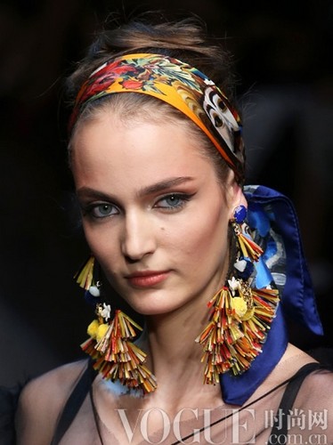 五颜六色的丝巾能让造型更有度假的感觉,又带着浓浓的复古学院风,凭借这样的造型去欧洲旅行,入海关时都不需要看护照了。要找到这种六十年代里维埃拉的感觉,在头发湿润时涂上摩丝,吹干后绑上围巾,留出的一部分头发沿发际线覆盖到耳朵上面;围巾后面的头发这时就可以盘成发髻了,只在马尾的根部盘一圈,这样留下的发梢比较长,再将发梢从发髻的中间穿过,好像打一个结,拉住发梢,用3或4个发夹固定住发髻的根部,防止散开,这样就可以轻松拥有法式的优雅风情了。