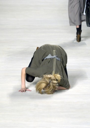 非常不幸的是,这并不是事实。在一些情况下,模特们面临相当严峻的挑战。比如高级定制中重达十到二十几公斤的长裙,一方面十分沉重,影响模特的扭动,另一方面,垂坠的裙摆常常容易引起摔倒。摔倒,常常意味着一个模特职业生涯的结束。
