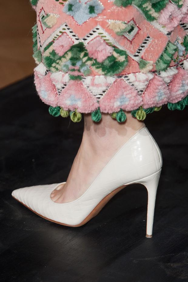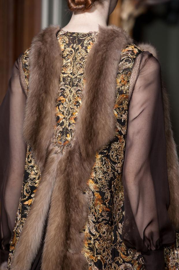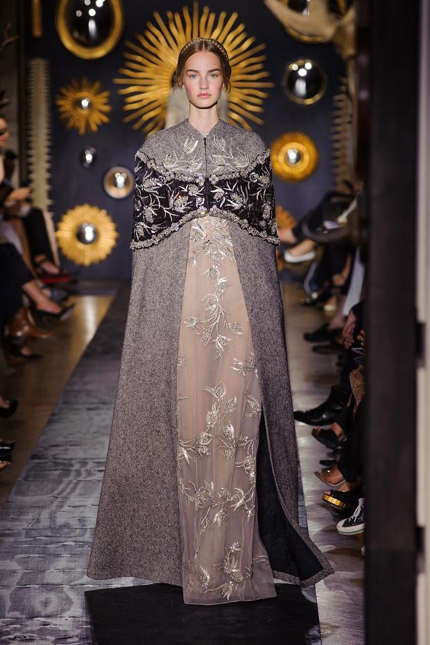 在上两季奠定了标志性的女王轮廓后,Valentino开始在材质、工艺、细节上愈加追求精致与奢华,大幅的重工蕾丝堆砌,大量的珠绣镶嵌,大片的羽毛拼接,在温暖如秋色的光泽下,模特们成为了文艺复兴时代油画中留下的贵妇名媛:好不容易出重金请来名师绘画,当然要将财富都穿上身,为历史长河中留下那么一道华美之光。不管怎么说,这一场秀可以说是最符合高级定制历史起源的系列,即使轮廓上没有新意,但光泽感营造出的气场已经瞬间俘获人心,尤其是你慢慢地留意每款设计、每个风格搭配,其实你还是会找到一些脱离奢华铺陈外的趣味。