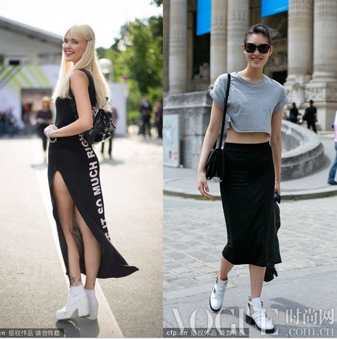 巴黎高定时装周上,潮人完美演绎短款上装造型,灰色半袖短款T恤搭配黑色过膝半身裙,轻便小挎包和白色平底凉靴无一不体现造型的随性有型。