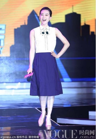 电影《不二神探》发布会现场,铆钉无袖白色衬衫,搭配复古藏蓝色半身裙,及膝的长度优雅不失几分俏皮。