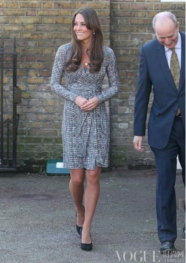 凯特着由艾尔丹姆(Erdem)设计的印花连衣裙,经典款便鞋,拿藏蓝色手包到一小学参观。