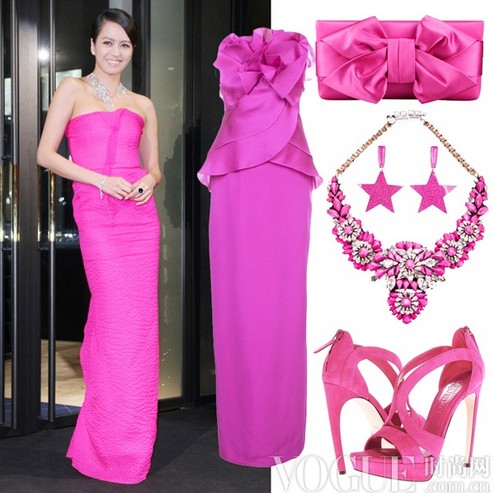 一袭优雅修身礼裙现身的梁咏琪,桃粉色的缎面质地无疑是增光添彩的法宝,搭配夸张的水晶项链与娇俏点睛的耳环,无疑是她浪漫气质的婉约表达。作为七夕约会装备,桃粉色的镂空高跟鞋与甜美的蝴蝶结手包,也是你的不错选择。