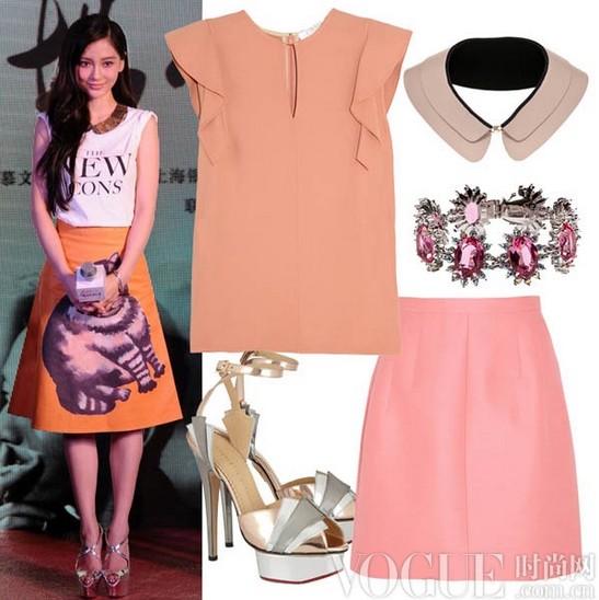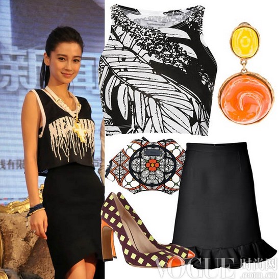 俏皮玩味的无袖短T,作为Angelababy的修身法宝百搭不厌。与简约及膝的褶裥裙搭配,清爽又率真。且不说腕间的民族风格珠串手链如此典雅,一件闪耀的十字架项链,便能衬托出她气宇非凡的好品味!