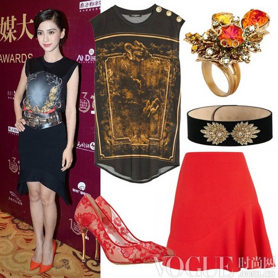 弥漫着文艺风情的印花无袖T,无论是出席红毯还是日常穿着,都成为Angelababy的心头之好。与浪漫修身的荷叶边半身裙搭配,加之宽腰带的酷辣点缀,令她成功化身复古潮女,释放出无尽的优雅气息。