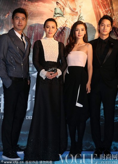 北京,刘嘉玲、Angelababy换装出席《狄仁杰之神都龙王》首映式。刘嘉玲的黑色长裙更显端庄,或许与