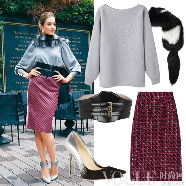 皮革超宽版腰带在本季最为流行,无论是拉链装饰,还是多扣带点缀,总给人带来狂野不羁的异域情怀。针织套头衫和个性铅笔裙相衬,绝对是修身有型的经典Look。如果是参加晚宴或派对,那么选择一双金属质感高跟鞋,亦或是用皮草围巾点睛,也是小奢优雅的点睛之选。