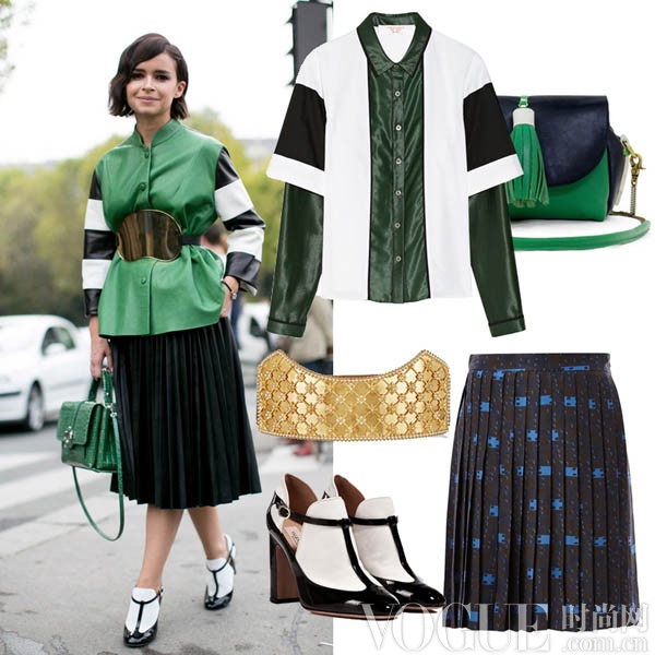 想要营造不一样的酷辣风情,亮金装饰的宽腰带一定必不可少!就算你的上衣松垮无形,只要拼接得足够精彩,搭配亮金宽腰带也绝对时髦抢眼。选择剪裁考究的百褶裙,不仅可以掩盖水肿的下半身,同样优雅迷人。如同俄罗斯时尚潮人Miroslava Mikheeva Duma所演绎,在鞋包上小添创意,也能为你赢得不少好感。