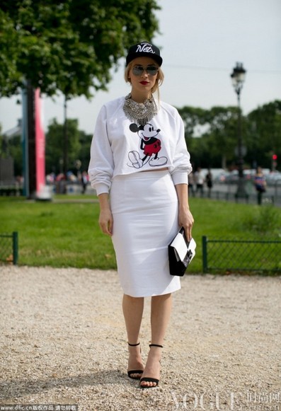 2013年巴黎秋冬时装周街拍:白色米老鼠卫衣,一色半身裙,鸭舌帽。