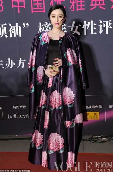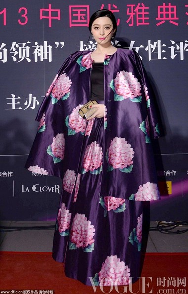 近日,范冰冰身着花朵装饰风衣和复古高腰裙装亮相某颁奖盛典,对于巨大的花朵图案及廓形裁剪褒贬不一。
