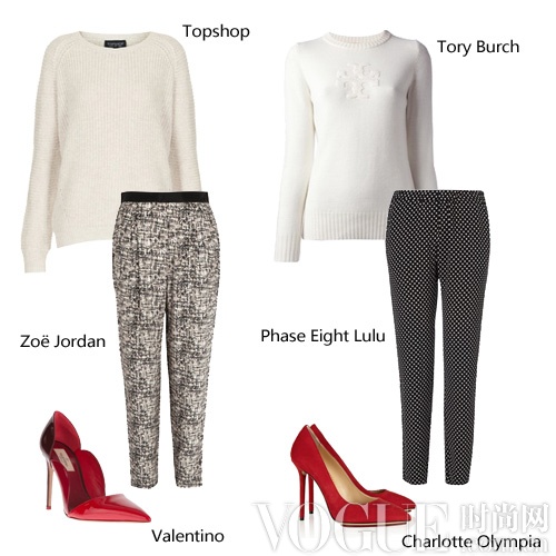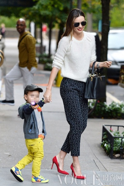 Miranda Kerr 身穿白色毛衣搭配毛呢提花七分裤,脚踩红色高跟鞋成为全身的亮点。看似厚重的毛呢长裤在白色毛衣的搭配下月多了几份轻盈的感觉,甜美又摩登十足。