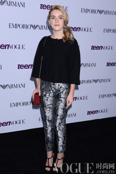 Kiernan Shipka从头到脚一身Emporio Armani的单品,黑色的短款小外套搭配精致的绸缎七分裤,短款的外套和剪裁干练的裤装无形中拉伸Kiernan的腿部线条,低调奢华。