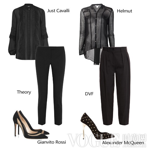 Rosie Huntington-Whiteley 身穿Dolce & Gabbana透视衬衫和七分长裤,脚踩Christian Louboutin黑色高跟鞋, 透视的黑色衬衣透出隐隐的性感气息,中和了长裤和衬衣过于硬朗的造型。