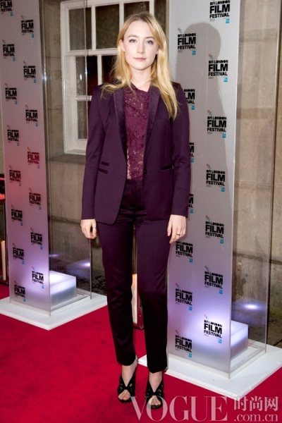 Saoirse Ronan身穿The Kooples酒红色套装脚踩一双Nicholas Kirkwood黑色镂空鱼嘴高跟鞋,内搭同一色系的蕾丝上衣,干练帅气的同时又不忘展现自己女人味的一面。