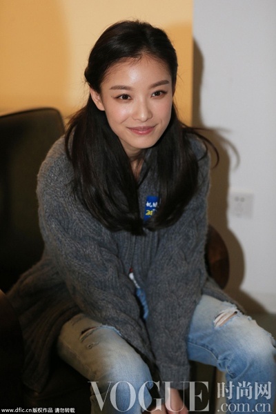 倪妮原色破洞牛仔裤搭配灰色针织开衫,彰显无尽青春气息。