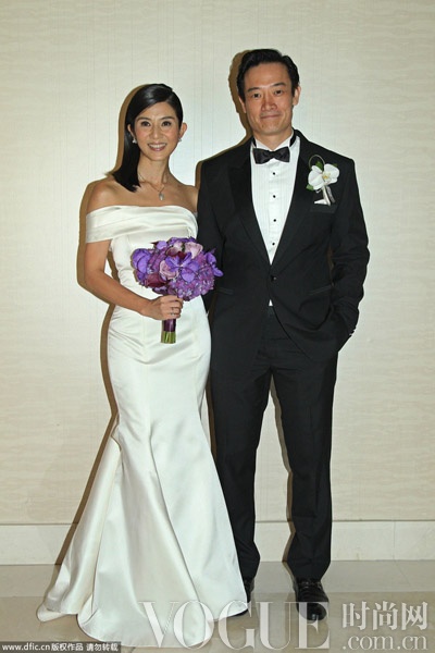 当地时间2013年11月2日,新加坡,杨采妮在新加坡与邱韶智完婚。杨采妮所选择的一字肩缎面鱼尾裙款式婚纱,样式十分简洁没有任何蕾丝和珠串装饰,非常符合杨采妮清新的气质。