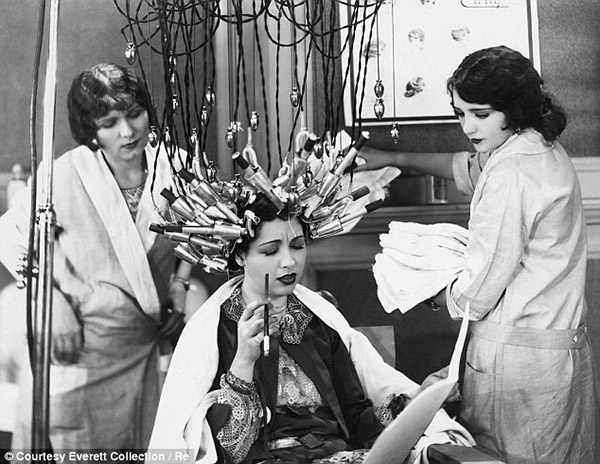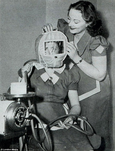 二次世界大战前,妇女们为了打造浓密的发卷常常要在沙龙里一呆就是好几个小时,这款八爪鱼一样的奇怪装置通过很多发热的钳子烫发,将头发分区后卷在钳子上,就能打造持久的卷发。