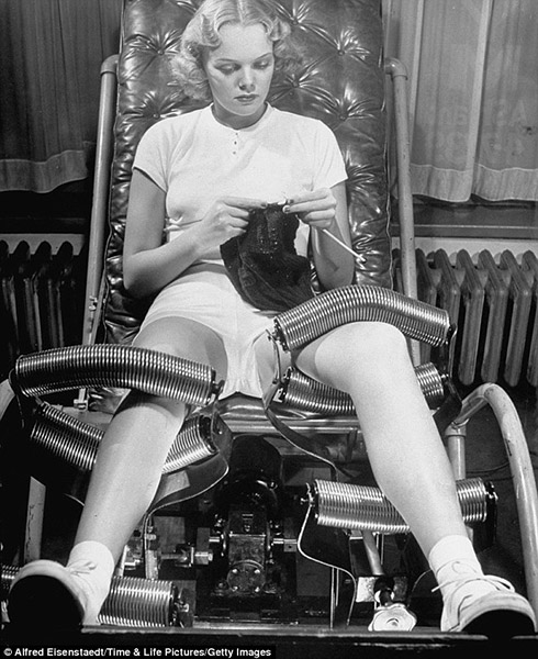 0年代知名的Slenderising沙龙有各种方式的减肥疗程,从全身绷带疗法到按摩椅。这款椅子依靠金属卷轮按摩你的腿部,达到融化脂肪的目的。