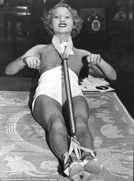 这款30年代推出的健身器,一根金属弹簧两头连着绷带,将绷带分别绑在脚踝和脖子上,这样做仰卧起坐能锻炼到腹部肌肉。