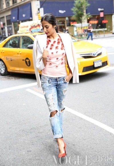 充满女人味的立体花朵粉色T恤,搭上破洞牛仔和白西装,兼备优雅和气场,加上红色细高跟,行进中美感流泻。