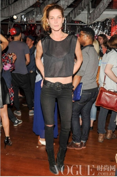 露脐的上衣已经十分抢眼,而破洞牛仔铅笔裤的颓废风格与上衣形成极佳的呼应,摇滚look塑造一步到位。