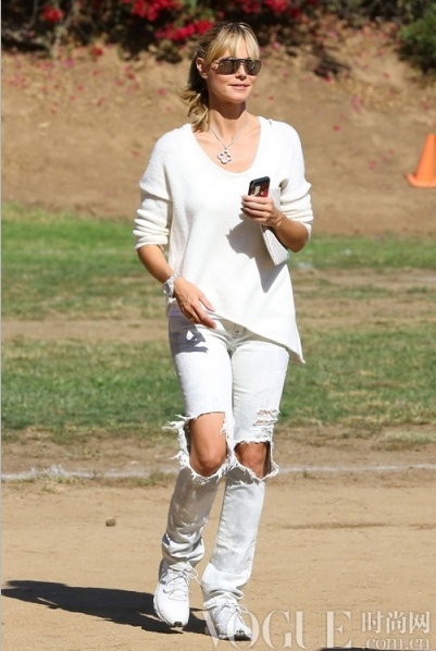一身的焦点全落在了膝盖全破的牛仔裤上!加上宽松的针织衫和球鞋,本季风靡的运动风你可以直接来一次效仿。