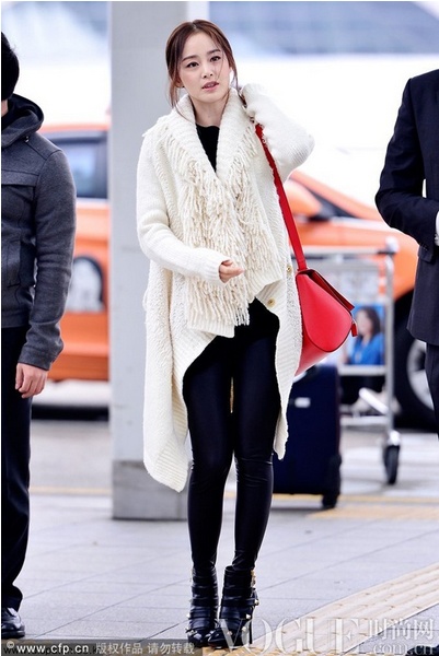 金泰熙白色不规则粗线开衫铆钉高跟短靴,红色单肩包出挑。