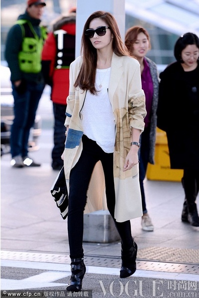 成宥利黑白衬衫搭配白色长款西装外套,黑色长裤皮靴以及黑色手袋。