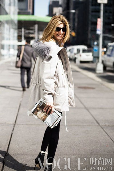 派克外套通常以军绿色和黑色居多,Sarah Rutson的这件白色派克让原本男人味十足的外套多了几份小清新的味道,黑色的leggings与宽大的外套形成对比,突出其纤细的腿部线条。