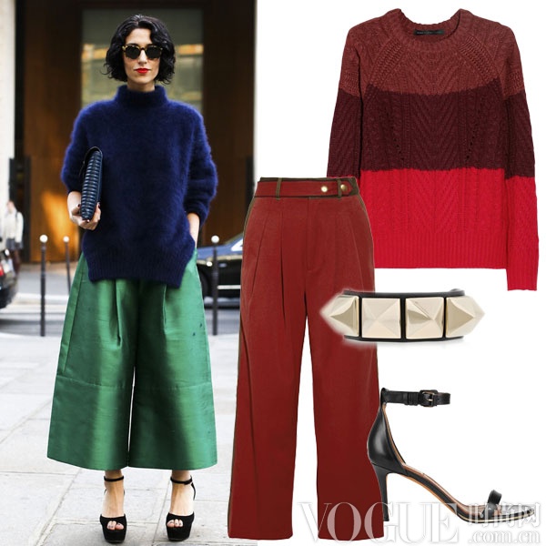 这一季我们看到,除了常见的遮住高跟鞋的曳地长款阔腿裤外,九分裤造型也是相当不错的选择。在颜色选择上明度降低,饱和度提升就会让整体造型立刻温暖起来。当然一双高跟鞋和金属感的配饰是绝对不能少的。