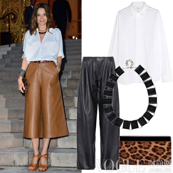 皮革质地阔腿裤硬挺的质感适合打造硬朗的女性形象。上衣选择简洁款式白色衬衫,把上衣束进皮裤中增加利落感。想增加性感女人味,就可以在配饰上花些心思,一个狂野款式豹纹手包就可以满足你的需求。