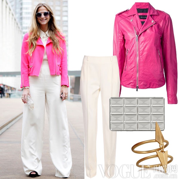 用靓丽的色彩来挑战冬日的沉闷吧!何不选择一件帅气的荧光色机车夹克,搭配一条温暖的羊毛阔腿裤,整身装扮一张一驰优雅有型。金属质感的手拿包以及指环,画龙点睛。