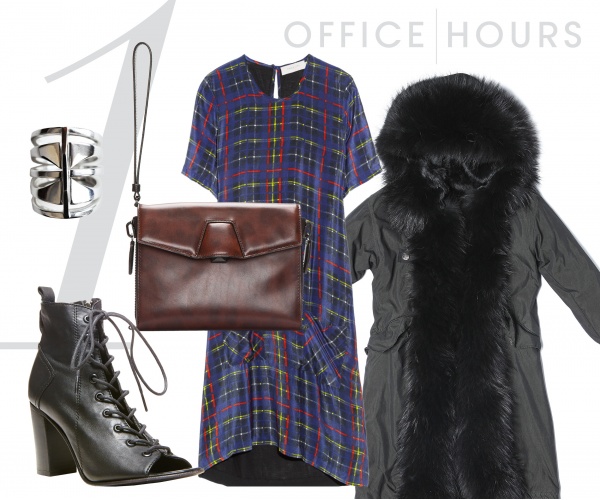 Furs毛边连帽黑色派克大衣极融合进了皮草的细节,时髦而带着点奢华感,搭配黑色系带短靴和棕色手拿包,穿进办公室也一点不违和。根据搭配,任何场合都可以有派克大衣的亮相。