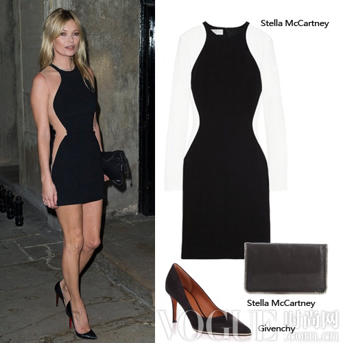 McCartney视错觉拼接小礼服亮相,侧缝肉色拼接像是裸露在外的肌肤,除了性感之外还在无形中修饰了她的身体曲线。