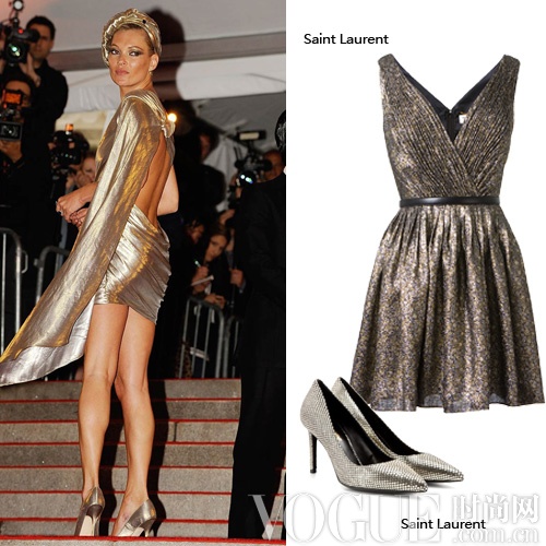 Moss身穿金属质感礼服亮相红毯,飘逸的肩带与露背细节让整个look柔和很多,同样材质的裹头巾则增添了几份复古气息。