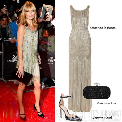 Moss身穿金色串珠流苏装饰迷你连衣裙亮相,变身20年代的爵士名伶,齐刘海的发型一改往日女王的强势气场,走起小清新的路线。
