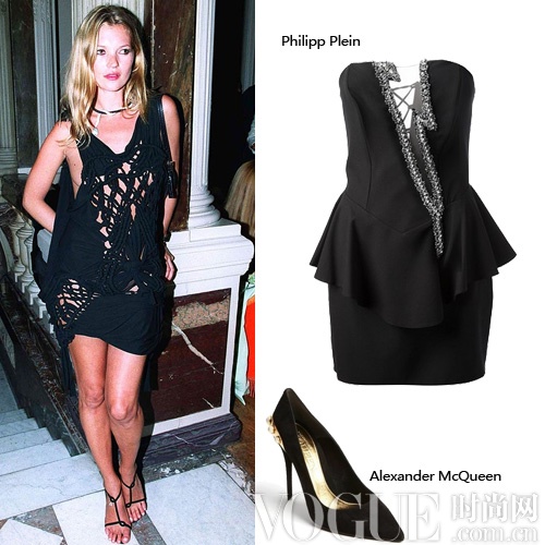 Moss身穿镂空编织黑色小礼服,不规则的镂空细节让身体变得若隐若现,充满诱惑与不羁的性感气息。