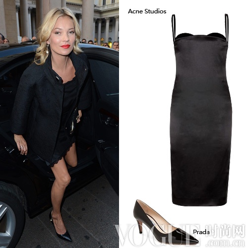 KateMoss身穿黑色真丝睡衣式连衣裙亮相,外面搭配一件黑色的短款外套,随性性感。