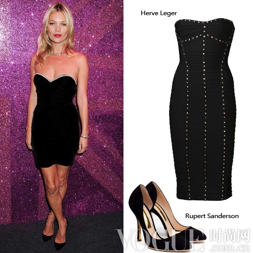 Moss身穿天鹅绒材质抹胸小礼服,简洁的设计只在边缘处用一串珍珠进行装饰,性感优雅。