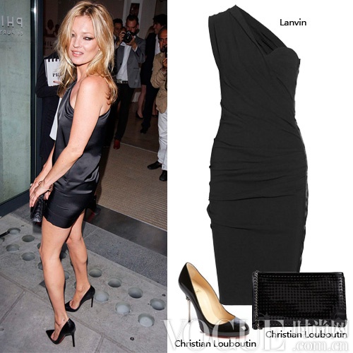 KateMoss身穿黑色单肩包臀礼服,宽松的真丝材面料在上半身形成自然垂褶,让极简的裙子层次丰富了许多,及臀的长度凸显出Kate