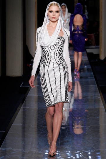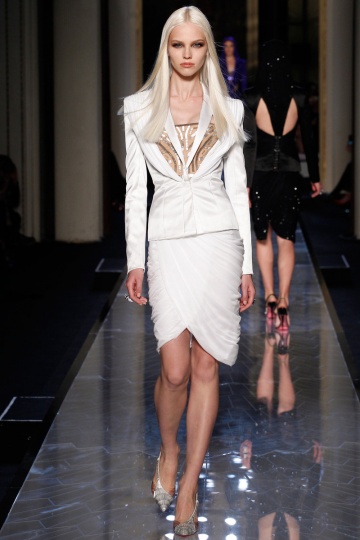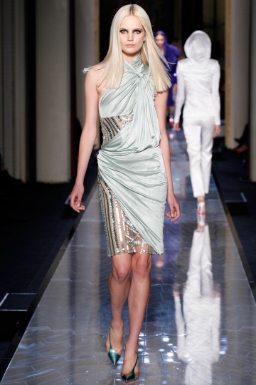 2014春夏高定时装周首日,Versace一如既往在晚间拉开此次高定时装周大幕,Donatella形容最新的高定系列为“当代女神”:“力量、果敢、强韧与魅力——这就是我所想的。”秀场放着Lady Gaga最新专辑《Artpop》里的歌曲《Donatella》,作为品牌代言人,她亦出现在秀场前排。