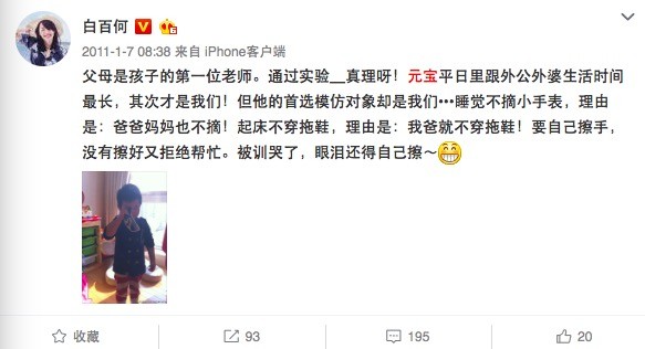 事实上,人生是自己的,父母失去了夫妻身份,但依然是监护者、陪伴者。有父母共同陪伴的成长固然是完整而幸福的,不能共同陪伴难道就该被人戳着后背说这孩子真可怜吗?更何况,从白百何的多条微博可见,外公外婆陪伴孩子的时间更多一些。